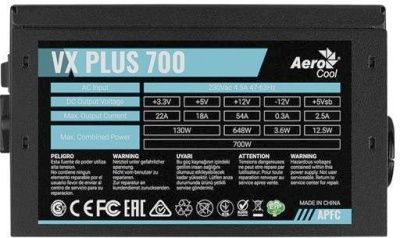 Блок питания 700 Вт Aerocool VX PLUS Series (VX-700 Plus) Retail (ATX, +12 В, активный PFC, вентилятор 120 мм, встроенные кабели, ATX12V: 20+4 / 4+4