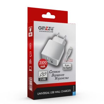 Зарядное устройство сетевое Ginzzu GA-3313UW (белый, 3,1A, 5V, белый, 2xUSB, для зарядки мобильных устройств + дата кабель 8pin APPLE Lightning 1.0м,