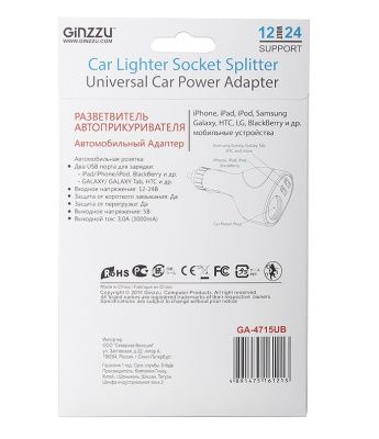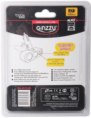 Зарядное устройство автомобильное + две авто розетки Ginzzu GA-4515UB (АЗУ 5В/3.0A, 2USB, 2 авто-розетки) [ GA-4515UB ]