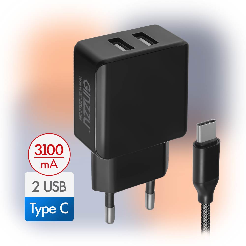 Зарядное устройство сетевое Ginzzu GA-3314UB (черный, 3,1A, 5V, черный, 2xUSB, для зарядки мобильных устройств + дата кабель Type C 1.0м, в нейлоновой