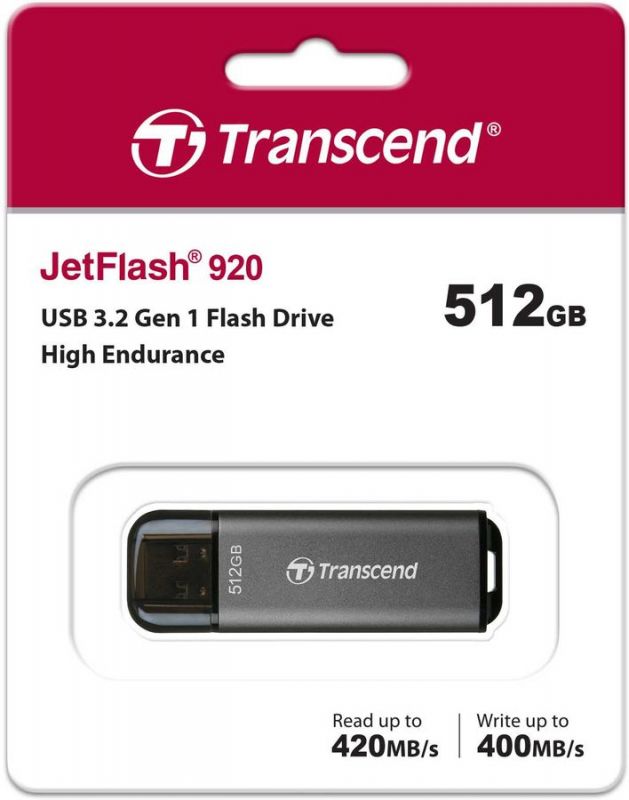 Флэш-накопитель 512 GB Transcend JetFlash 920 (черно-серый, алюминий, 400 MB/s 420 MB/s 62x20x7.8 мм, коннектор закрывается колпачком, USB 3.0 Type-A)
